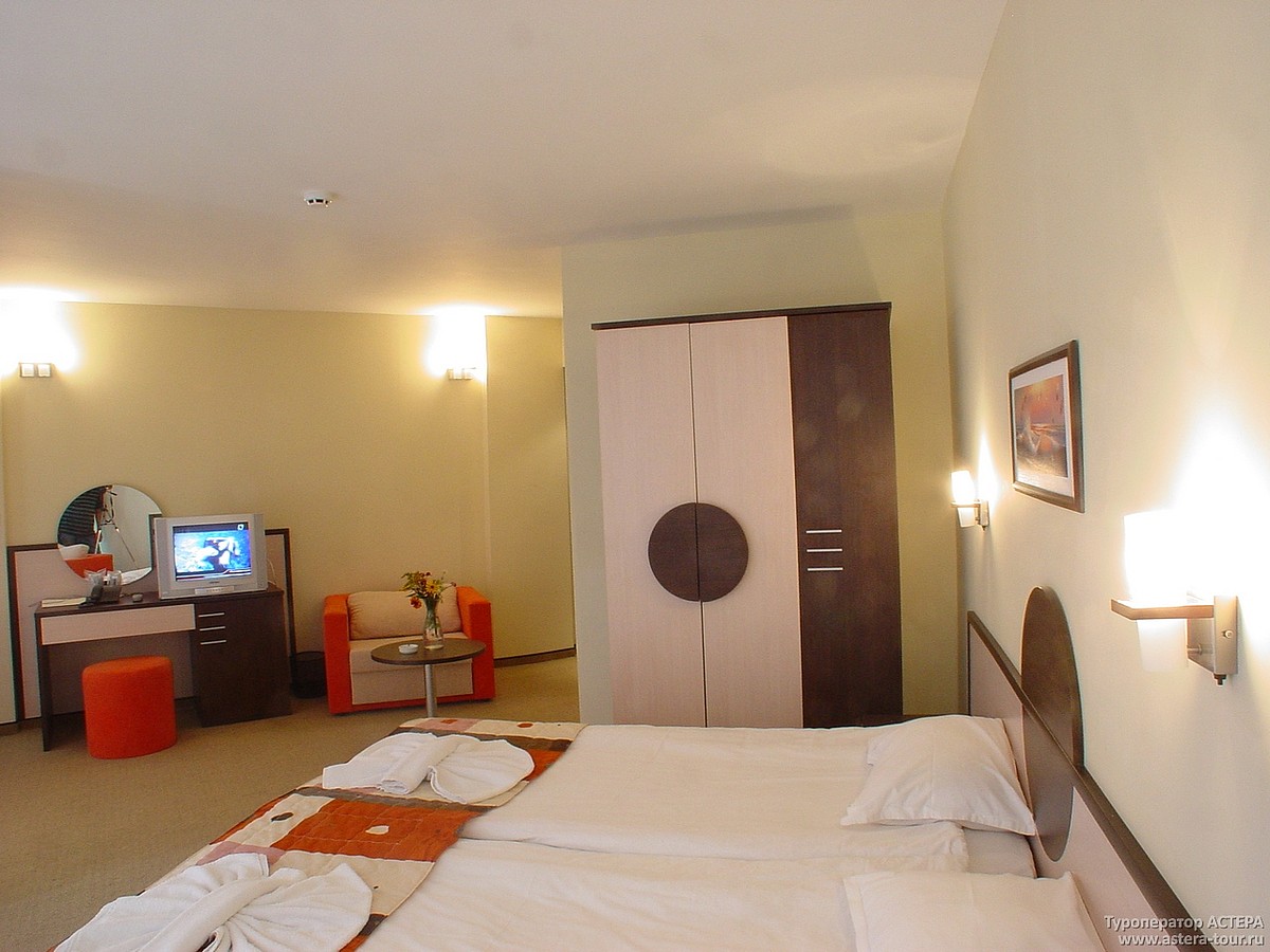 Полупансион. При отеле: панорамный ресторан предлагает богатый выбор блюд болгарской и международной кухни; a la carte-ресторан - предлагает меню с богатым выбором блюд болгарской и международной кухни; ресторан-пиццерия предлагает большой выбор пиццы, закусок, напитков; кафе предлагает чай, кофе, большой выбор десертов, закусок, прохладительных напитков; бар-паб предлагает большой выбор напитков, коктейлей, закусок; бар у бассейна предлагает разнообразные вина, коктейли, прохладительные напитки; бар в холле отеля предлагает разнообразные напитки и коктейли.