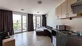 Студио. В номере: санузел с ванной или душевой кабиной, кондиционер, спутниковое ТВ, телефон, оборудованный кухонный уголок, балкон. Пол в номере - плитка.